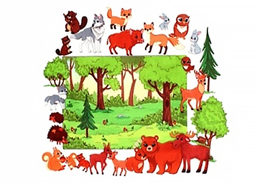 Игровое поле с карманом 28*20см, Животные с детенышами, Два дерева и пень. Фигурки на липучках. От 3х2 до 8х8см.