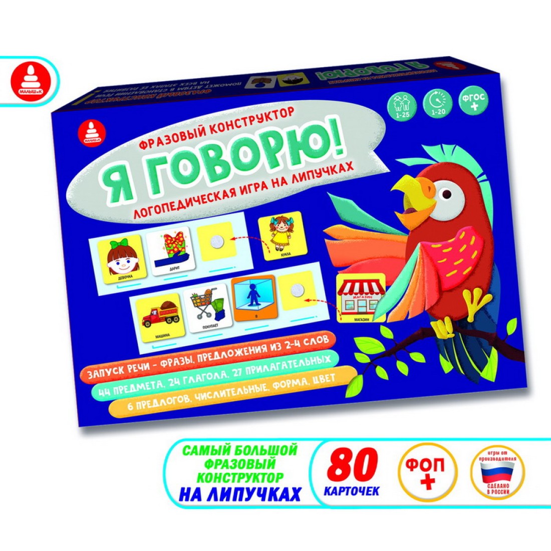 Комплектность: 4 схемы предложений, 4 схемы местоимений, лист ковролина для составления длинных предложений, 80 карт с изображениями предметов, их действий, признаков и 97 липучек