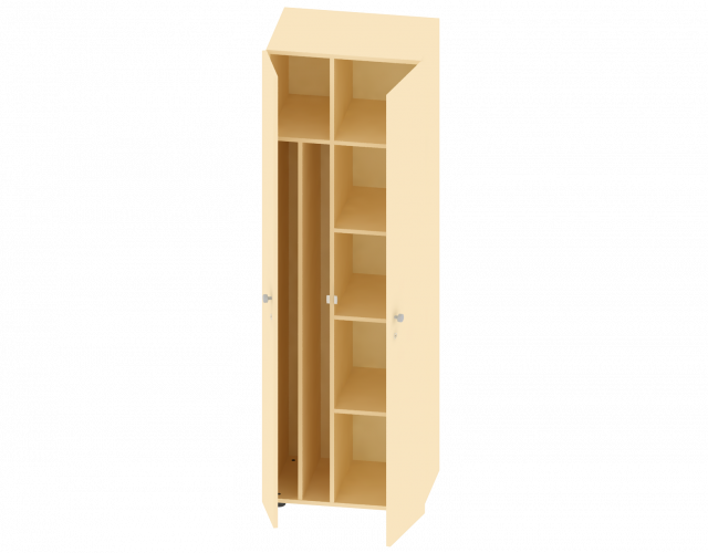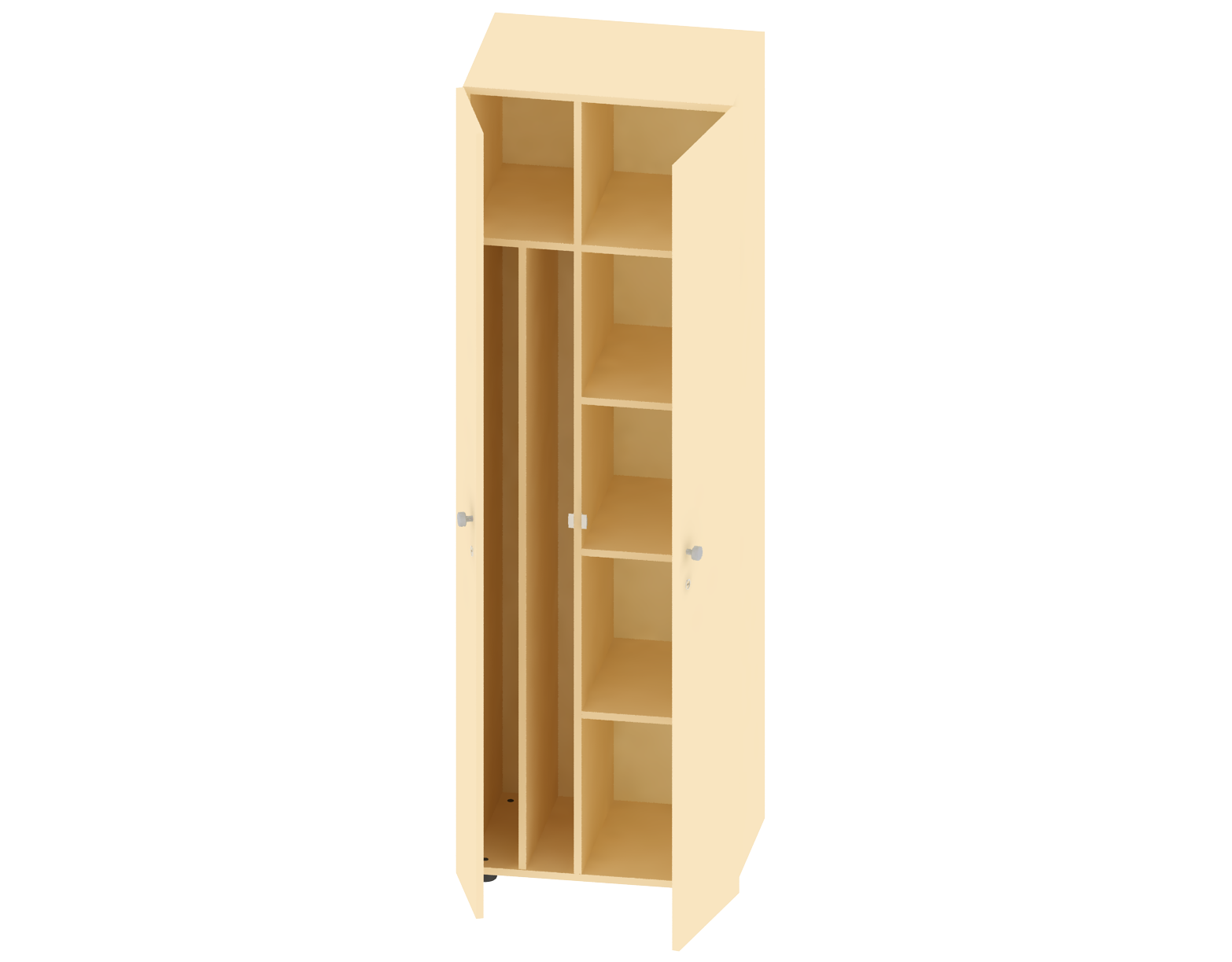 Размер (ШхВхГ): 564х1800х400 мм. Две секции. В первой секции две шириной по 10 см , высота 140 см. Во второй секции две нижнии ячейки высотой 35 см. Две двери, на каждой замок. Материал: ЛДСП 16 мм, кромка ПВХ. Цвет по согласованию с заказчиком.