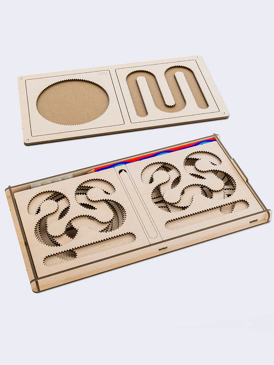 Спирограф включает в себя: коробка для хранения; 6 рамок нейротренажера; 3 рамки спирографа; 6 больших шестеренок; 8 маленьких шестеренок; 2 стилуса; карандаш; инструкция