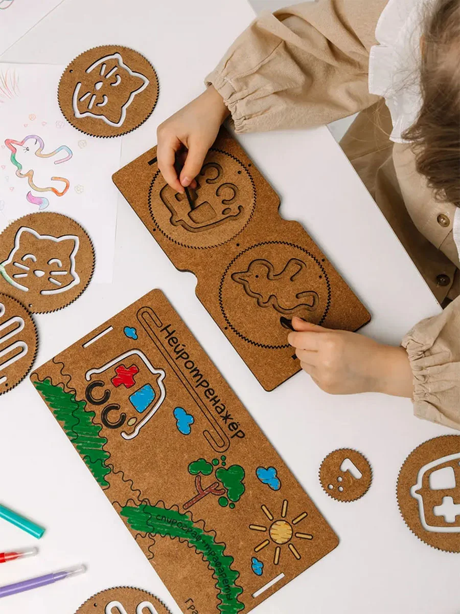 Это уникальная развивающая игра для детей, направленная на тренировку координации, моторики, внимания и синхронизацию работы обоих полушарий мозга. Ребёнок ведёт палочку или карандаш по вырезанным дорожкам с разными формами (животные, транспорт, лабиринты), развивая: