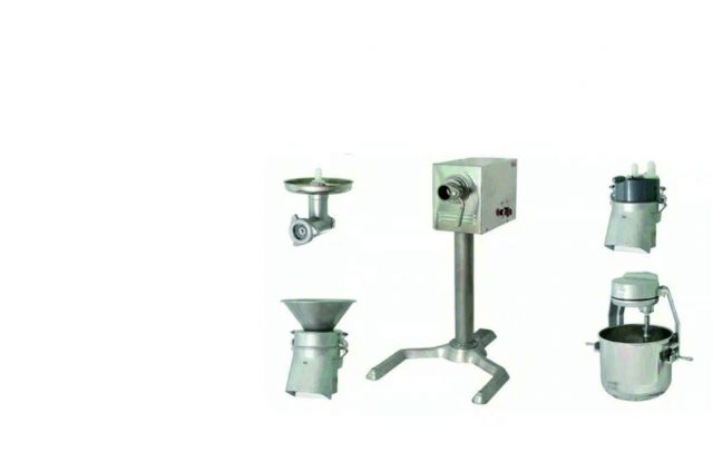 В комплект входят: приводной механизм (приводит в действие отдельные сменные механизмы), механизм для приготовления мясного и рыбного фарша (Производительность – 250 кг в час. Наружный диаметр решеток – 82 мм. Диаметр отверстий ножевых решеток – 5; 9 мм.), механизм овощерезательно-протирочный для нарезания сырых овощей и шинковки капусты, нарезания вареных овощей, протирания вареных овощей, фруктов и творога (Количество рабочих дисков – 6 шт. Нарезка овощей 200-350 кг в час, протирка картофельного пюре 600 кг в час), механизм для взбивания и перемешивания (Взбивание кондитерских смесей; замешивание жидкого теста; взбивание картофельного пюре, мусса и самбука; перемешивание мясного и творожного фарша) и подставка(на нее устанавливают приводной механизм). Предназначена для механизации основных процессов переработки пищевых продуктов на предприятиях общественного питания (столовые, кафе, рестораны).